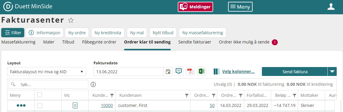 In Duett Økonomi, the order system is built as a workflow. You can place orders as an offer, started order, or an order ready for invoicing. It is also possible to enter a credit note.